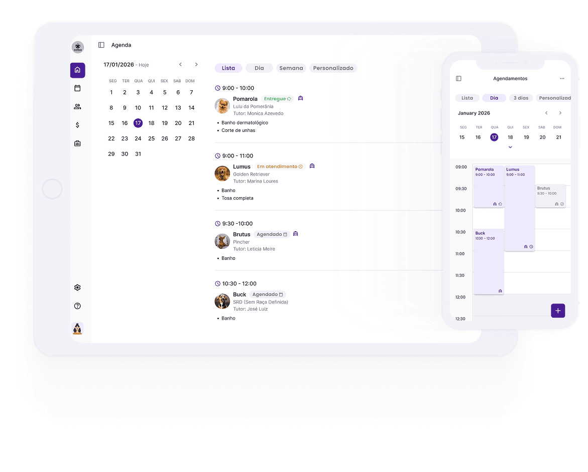 Um sistema que entende a correria do banho e tosa e devolve tempo para o cuidado com os pets. Simples de usar e sem perder proximidade com o tutor.